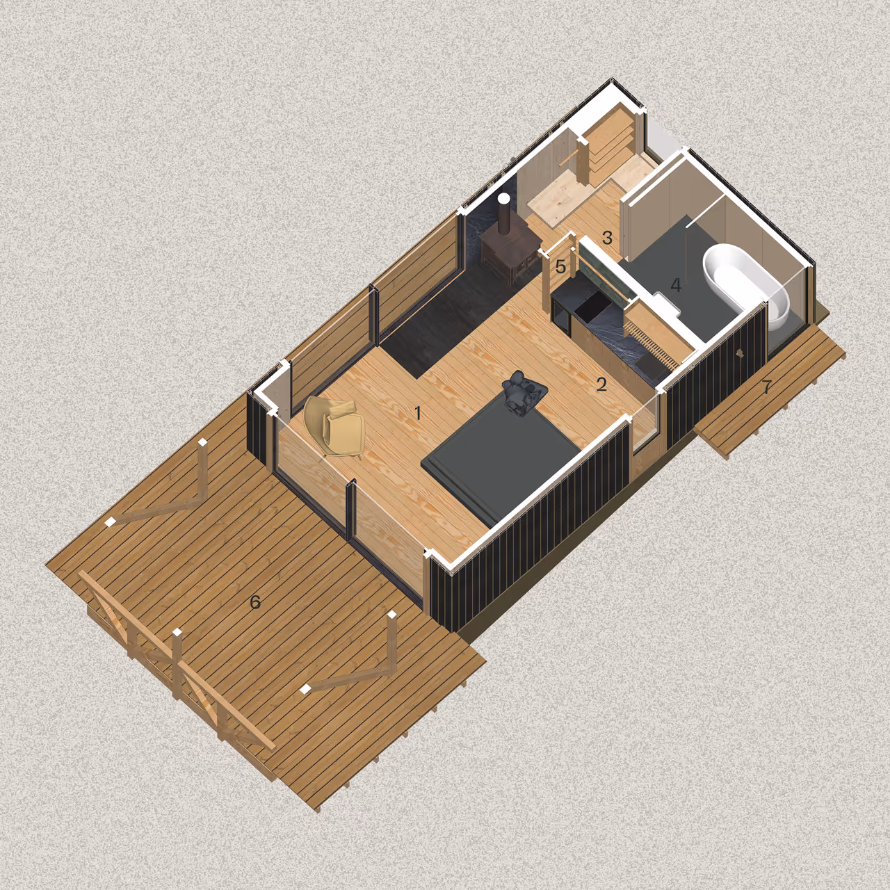 Response 1 offers the opportunity for observation, with the user's low-laying gaze being directed outwards on all sides. With a structural shell of cross-laminated timber, solid wood beams create large openings in the walls, up to 3.6 metres in length.
